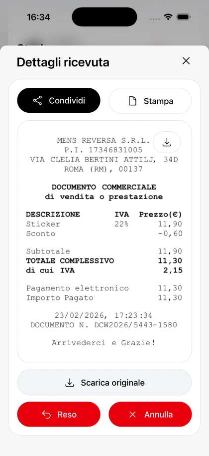 Sì. Puoi inviare la ricevuta via email, SMS o WhatsApp. Se ti serve, puoi anche stampare una copia con una stampante termica, così puoi scegliere di volta in volta il formato più comodo per te e per il tuo cliente.